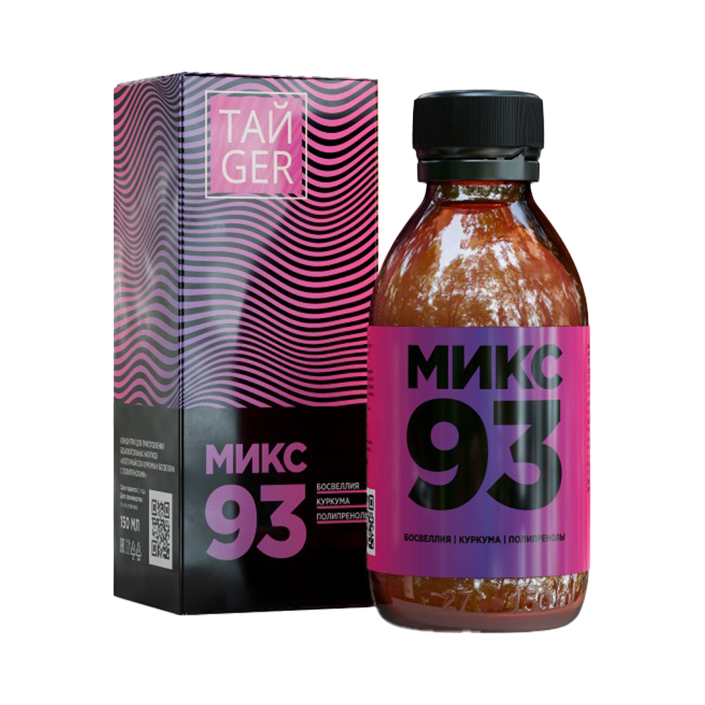 Микс 93 ТАЙGER – мощный противовоспалительный комплекс на основе куркумы, босвеллии и полипренолов. Помогает справиться с воспалением разной этиологии и локализации: инфекции, поражение печени, воспаление на коже, в суставах, сосудах, ЖКТ, нервной, мочеполовой системе.