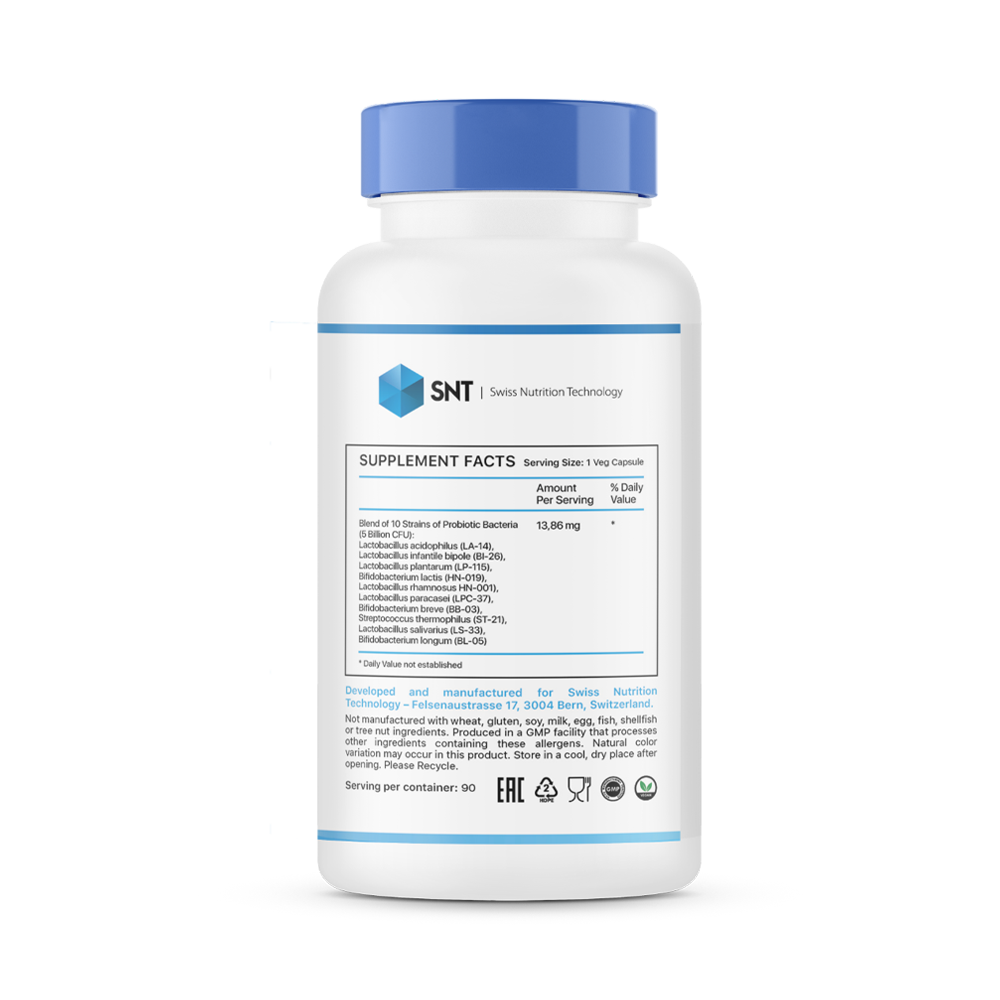 Пробиотическая смесь от SNT содержит 10 активных и клинически изученных штаммов пробиотиков. Исследования подтверждают, что пробиотические штаммы в составе пробиотика SNT чрезвычайно устойчивы к низким уровням pH и воздействию факторов желудочно-кишечного тракта (например, кислоты, желчи, пепсина и панкреатина), а также закрепляются на клеточных линиях кишечника.