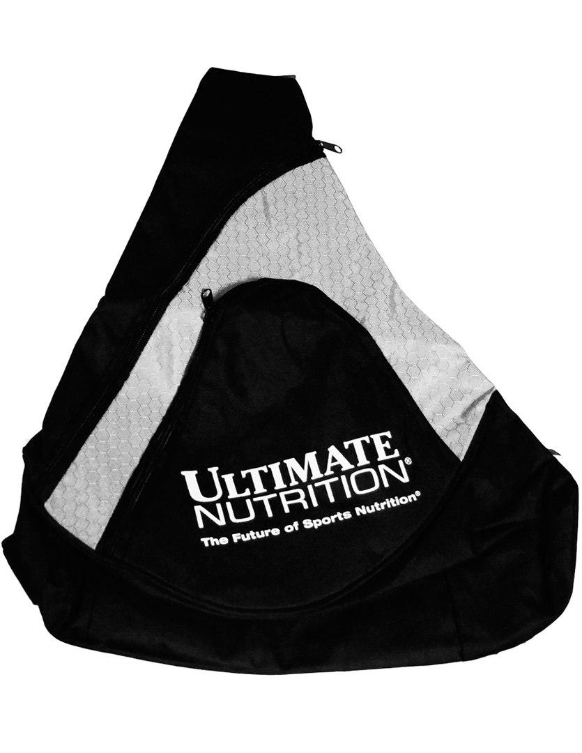 Рюкзак черного цвета и имеет прорезиненной надписи "Property of Ultimate Nutrition" снаружи.