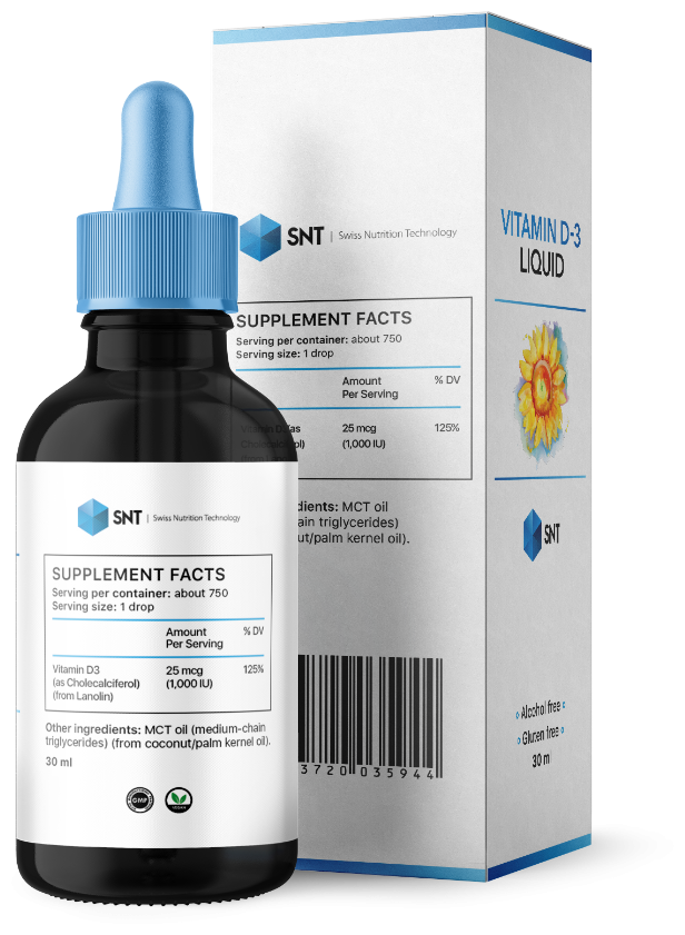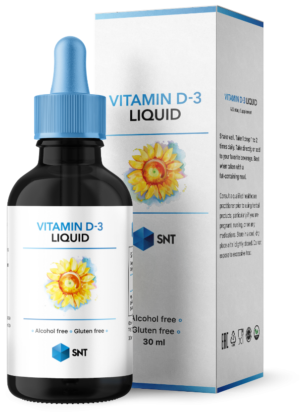 Витаминные капли SNT Liquid Vit D-3 поставляют этот ключевой для работы организма витамин в легко усваиваемой форме. Витамин D - это важнейшее вещество, которое синтезируется под действием ультрафиолетовых лучей и поступает в организм с пищей. Встречается в таких продуктах, как сырой яичный желток, печень рыб, а также иные морепродукты. Ввиду особенностей российского климата, большинство людей недополучает этот витамин естественным образом из-за недостатка солнечного света в течение года. Данный витаминный комплекс поможет восполнить нехватку витамина D-3 в организме.
